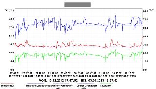 Vor dem Einstz des Datenloggers werden die Messintervalle bestimmt und eingestellt. Die Klimamessungen werden mit Datum und Uhrzeit auf dem Speicher des Geräts abgelegt. Am Computer können die gespeicherten Daten anschließend rabellarisch wie auch grafisch dargestellt werden. Anhand der gespeicherten Klimadaten lassen sich zu jedem eingestellten Zeitpunkt aus dem Messzeitraum von 2-3 Wochen die Raumlufttemperatur in °C, die relative Luftfeuchte in % und die Taupunkttemperatur ermittlen.